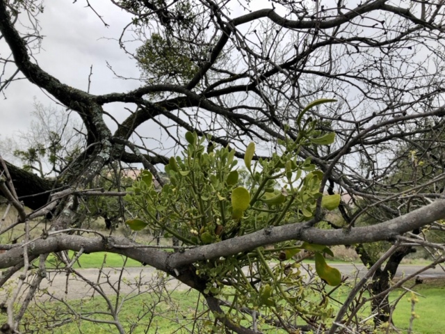 These trees are bare in winter. What then is that patch of green? That Christmas romance favorite, that pretty parasite, that mistletoe! Unlike ball moss, which clusters in our trees to gather its needs from the air, the mistletoe attaches to branches and draws in water and nutrients from the trees.